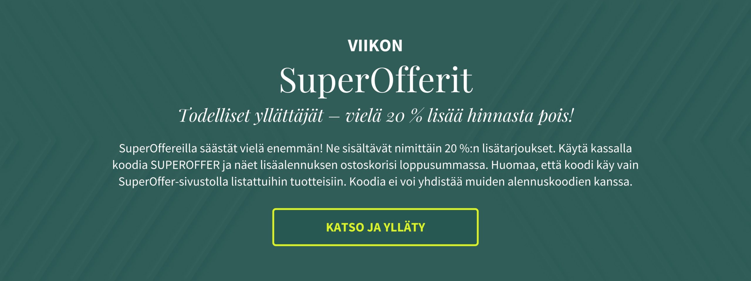 Käytä kassalla koodia SUPEROFFER ja näet lisäalennuksen ostoskorisi loppusummassa. Huomaa, että koodi käy vain SuperOffer-sivustolla listattuihin tuotteisiin. Koodia ei voi yhdistää muiden alennuskoodien kanssa.