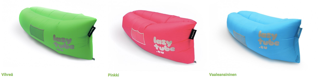 Lazytube-ilmasohva on kesän hauskin tuote. Lazytube sopii todella itsevarmalle laiskottelijalle – henkilölle, joka tietää arvonsa, osaa suunnitella aikaansa ja on saavuttanut elämässään monia asioita. Ilmasohva on erittäin helposti ja nopeasti ilmalla täytettävä, eikä pumppua tarvita. Lazytube on myös erittäin kevyt ja helppo ottaa mukaan – tuotteen paino on 1,25 kg pienen pussin kanssa. Lazytubessa on myös sivutaskut, johon on kätevää laittaa puhelin, iPad tai vaikkapa juomapullo. Lisäksi settiin kuuluu karabiini/pullonavaaja, jotta laiskottelu olisi mahdollisimman rentoa. Setissä on mukana myös ankkurikiila, jotta ylikevyt Lazytube ei karkaa tuulessa, jos vaikka mielesi tekee auringonoton lomassa vilvoitella vedessä.