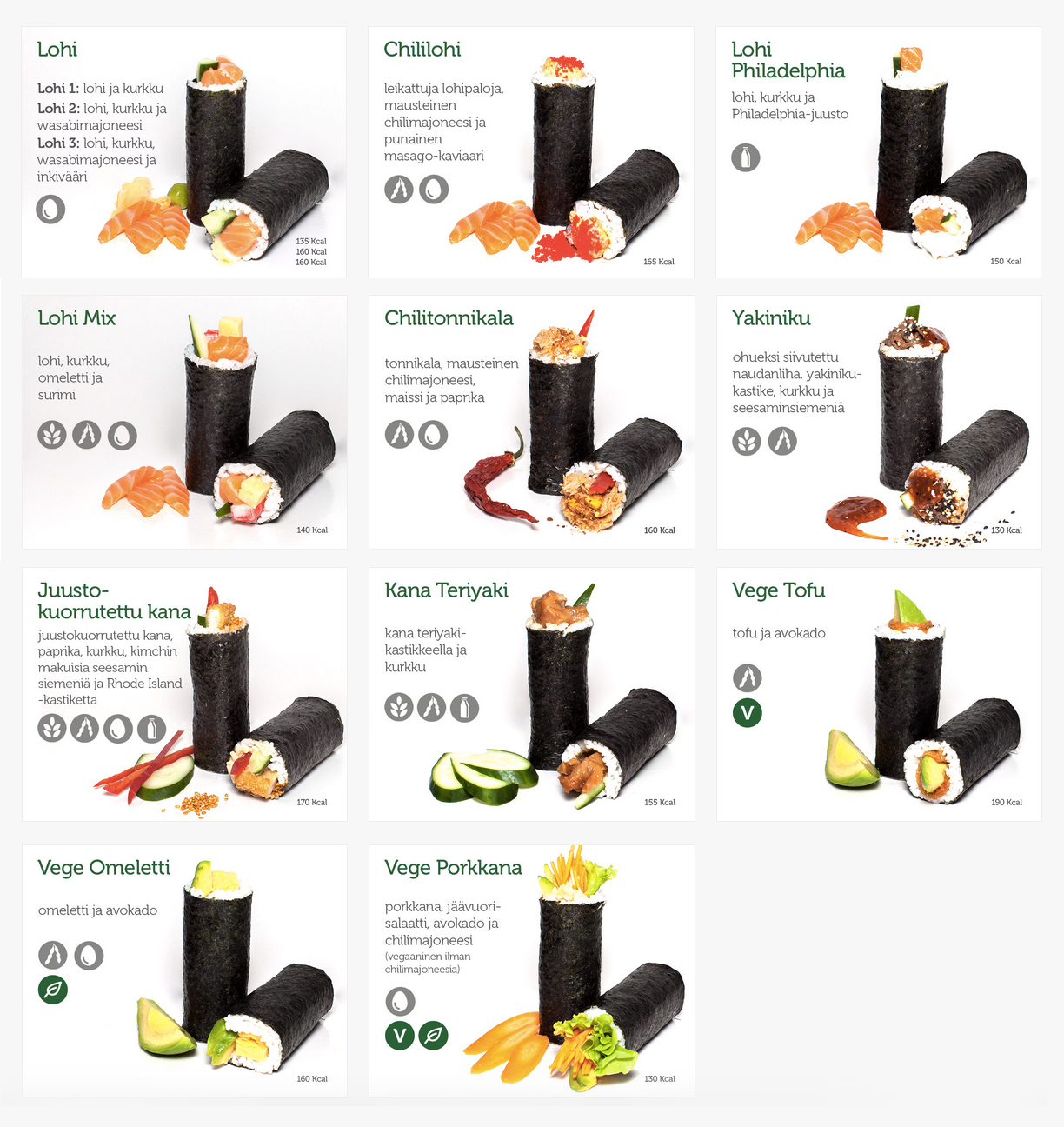 Valikoimassa on perinteisten sushitäytteiden lisäksi myös laaja tarjonta mm. vegaani-, kasvis-, kana- ja lihavaihtoehtoja.